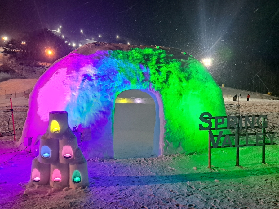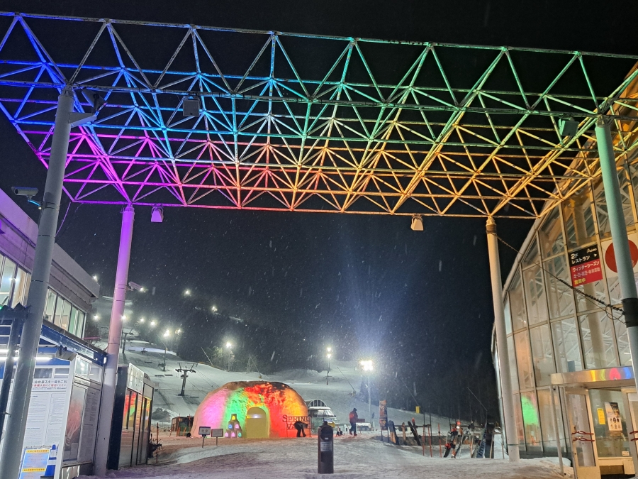 夜になるとかまくらとエントランスゲートもライトアップされます。昼とは違う幻想的なかまくらをお楽しみください!