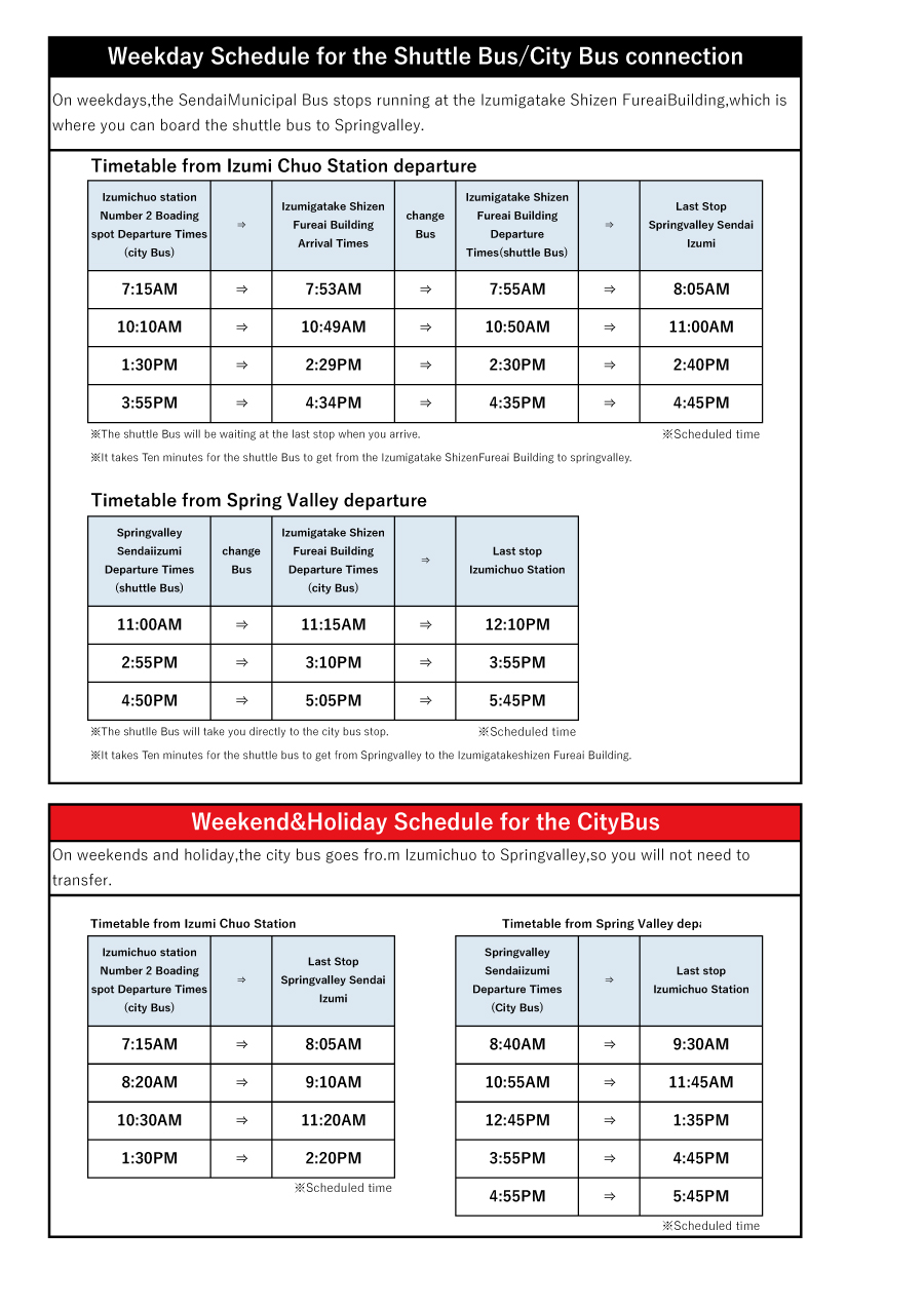 ◆平日は1つ手前の「泉岳自然ふれあい館」が終点・始発となりますので、路線バスの発着に合わせてスプリングバレーのバスが接続運転しております。