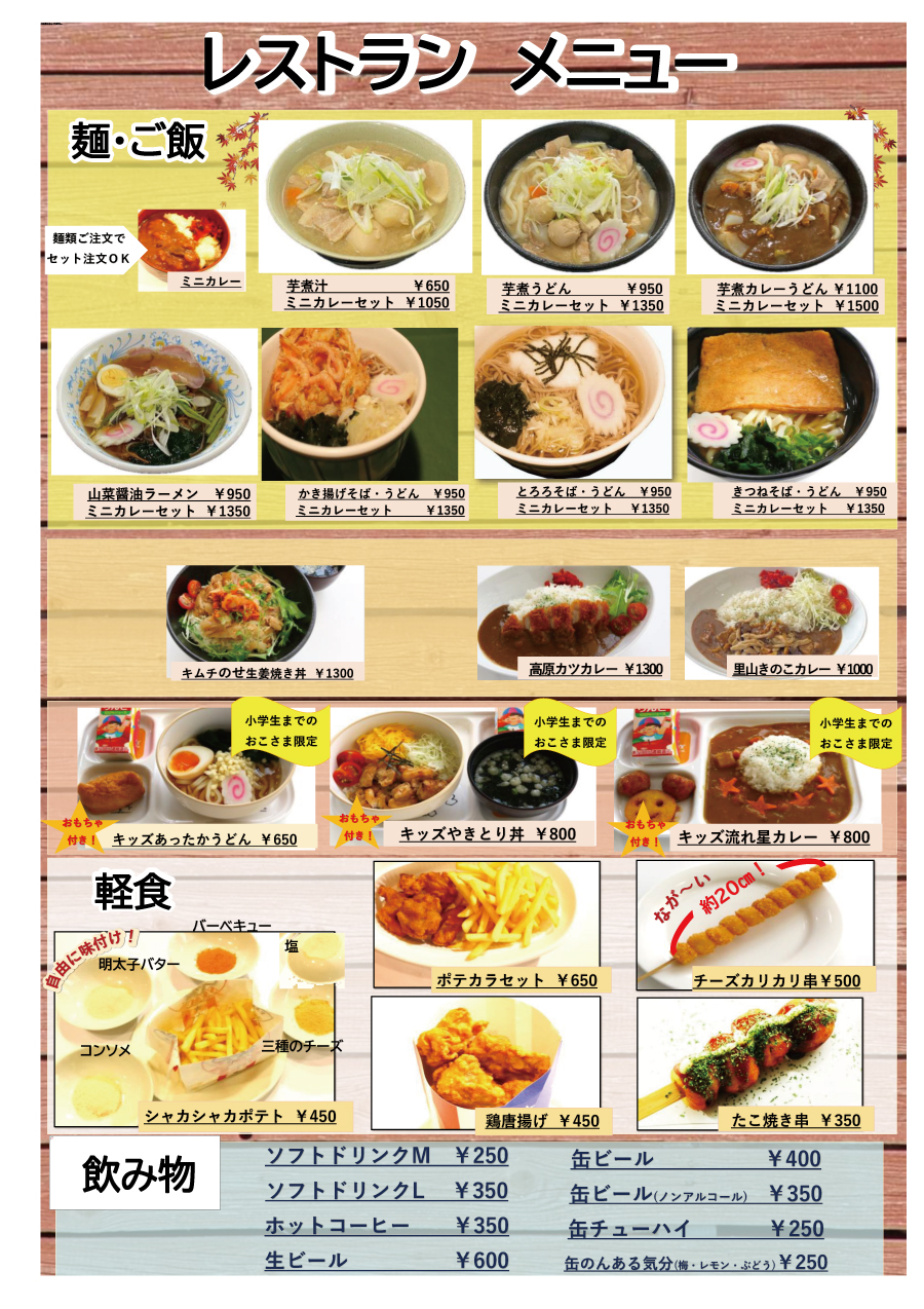 フードコート(レストラン1階) 麺類、ご飯、お子様メニューにスナック類などをご用意しております。 レストラン内は、冷房も完備しておりますので休憩にもご利用ください。 ●営業期間 2025年7月19日(土)~8月24日(日)、9月13日(土)~11月3日(月・祝) ●営業時間 軽食/ジェラート10:00~15:30、お食事メニュー11:00~15:00 ジェラートコーナー
